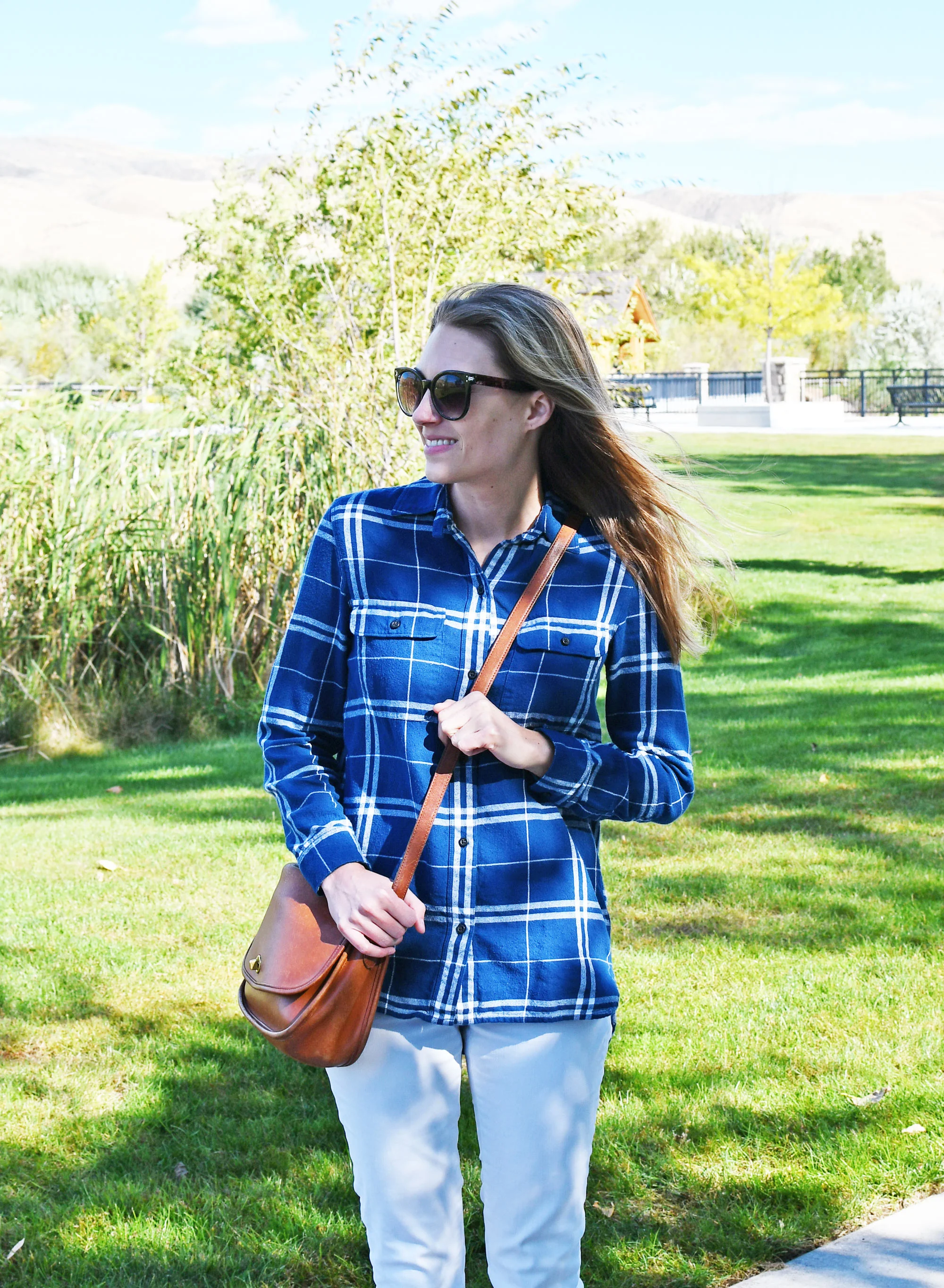 - blue and white plaid shirt outfits